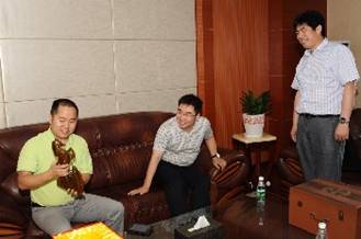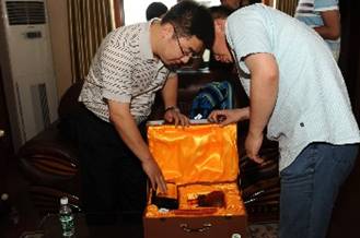 百度領(lǐng)導(dǎo)帶來的寓意深遠(yuǎn)的精美禮品在贈(zèng)送儀式開始之前,鞏總、金總認(rèn)真查看禮品